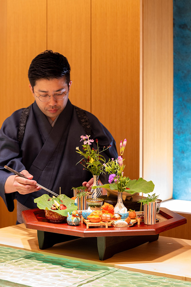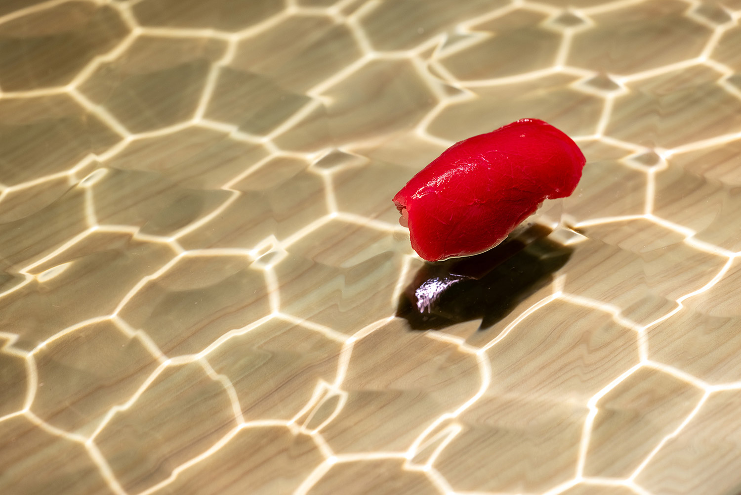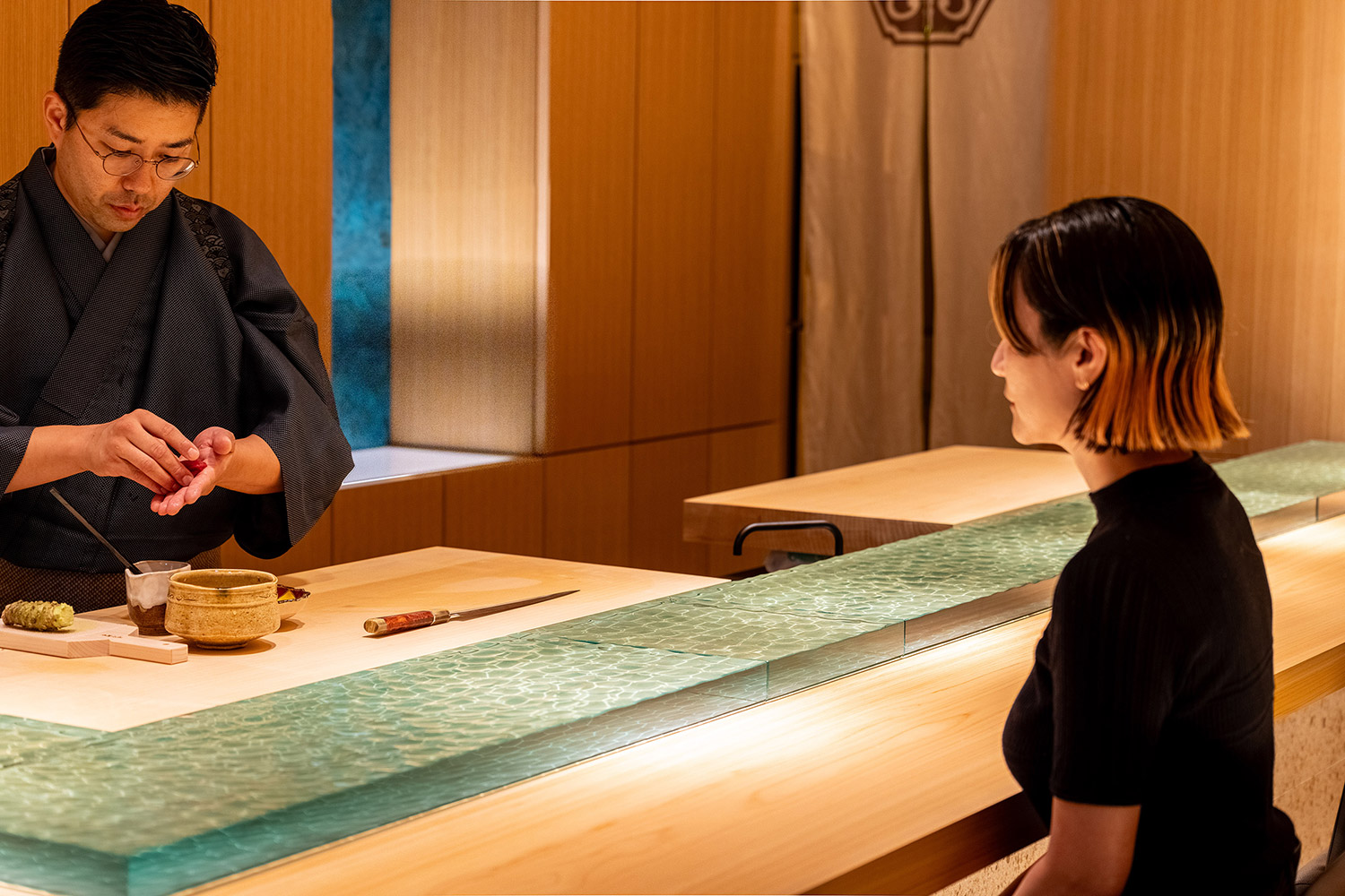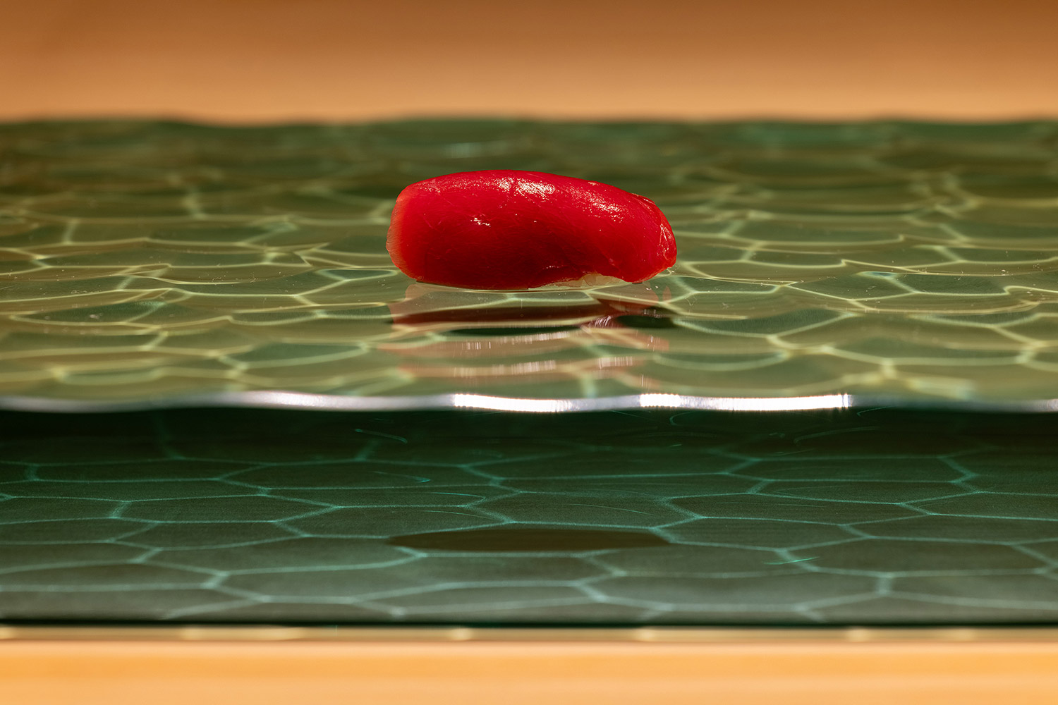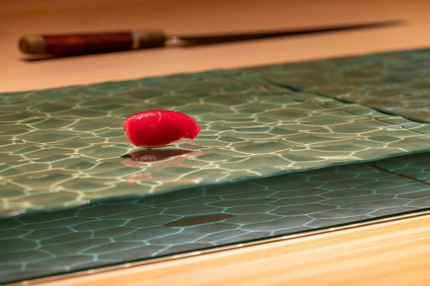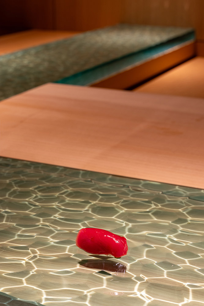 昔ながらのオーセンティックなお寿司屋さんは檜の付台に直接寿司を提供するが、ここでは水の流れを模したガラス製の付台に寿司を提供する。水面の光がキラキラと揺れる水底に寿司の影が映り、寿司が小川を泳いでいるように見える。お客様は寿司の写真を撮らずにはいられない。その写真をお客様がSNSにアップすることで、お店の情報が拡散され、お客様がまたお客様を呼ぶ。